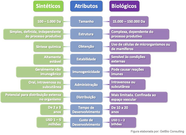No Quadro 1 são apresentadas as principais diferenças entre os medicamentos biológicos mais complexos e os sintéticos.