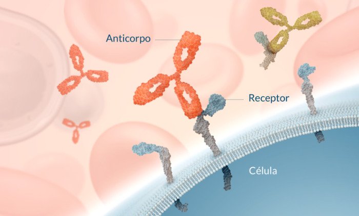 Os anticorpos monoclonais terapêuticos ligam-se a seus alvos com alta afinidade e especificidade. Esses anticorpos podem se ligar, por exemplo, a receptores na superfície celular ou a um alvo solúvel, desencadeando sua atividade biológica.